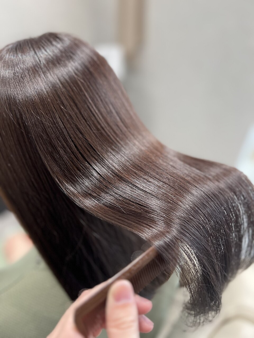 ストレートパーマと髪質改善ヘアエステを組み合わせることで、ただまっすぐにするだけでなく、自然なツヤとしなやかさのある仕上がりを目指します。